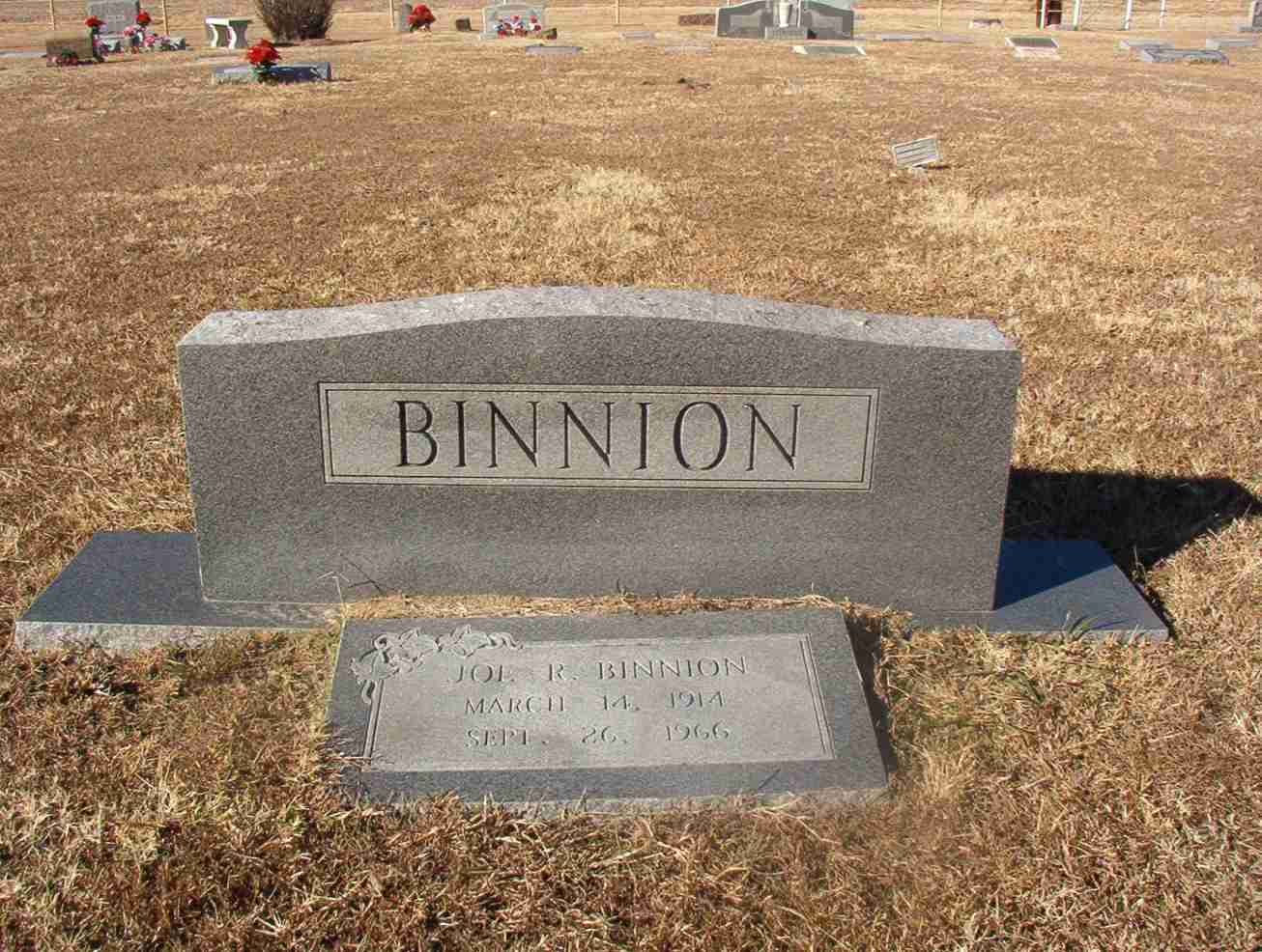 THE PARIS NEWS, 26 Sep 1966: 'Joe Binnion, 52, a plumber here, died Monday at 11:30 a.m. at home, 505 24th SE, after long ill health. He was a son of Lee and Ernie (Cannon) Binnion, born in Paris, 14 Mar 1914. The funeral, Wednesday at 2 p.m., will be held at Gene Roden and Sons chapel here, and interment made at Tigertown, Northwest of Paris. He had attended Paris schools and was a Presbyterian, and served in the Army in World War II. He married Miss Mildred Barham, 13 Jul 1943, and she survives, besides a son, Randy Binnion; a brother, J. E. Binnion, Dallas, and a sister, Mrs. R. B. Jessee of Gilmer.'