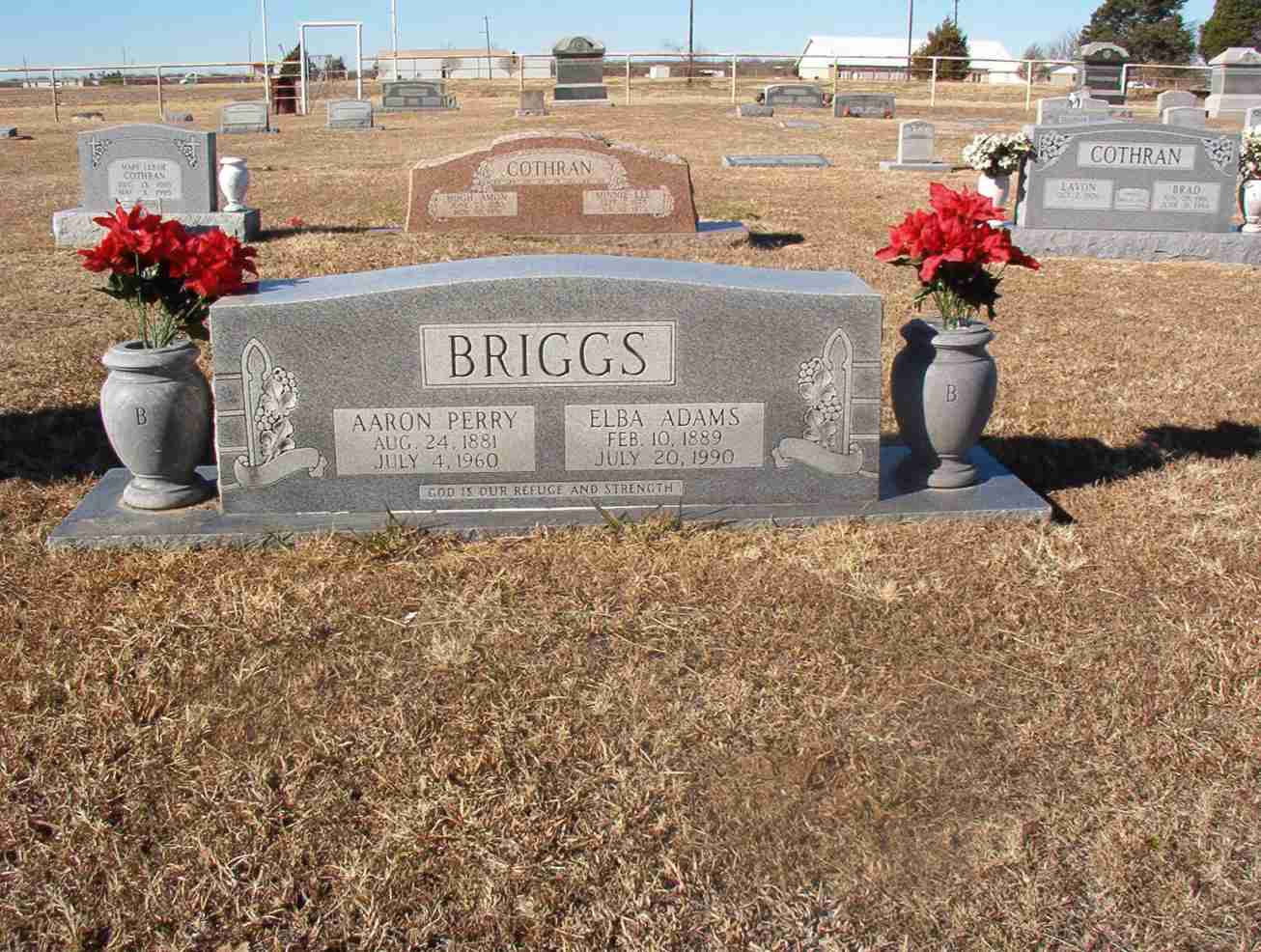 THE LAMAR COUNTY ECHO, 22 Jul 1990: "Elba I. Briggs, 101, 1407 Maple, died Friday, 20 Jul 1990, at St. Joseph’s Hospital. Services will be held at 3 p.m. Monday, 23 Jul, in Gene Roden’s Sons Funeral Home Chapel. Burial will be in the Tigertown Cemetery. Mrs. Briggs was born 10 Feb 1889, in Forest Hill, a daughter of William Henry and Melissa Zimreude Kuykendall Adams. She married Aaron P. Briggs in 1912. He died 4 Jul 1960. Surviving are two daughters, Miss Jimmie Ruth Briggs of Paris and Mrs. Ray (Iola) Hopkins of Caviness; two sons, Henry Briggs of Tigertown and Robert Briggs of Grand Prairie; eight grandchildren, 10 great grandchildren, and two great great grandchildren; two step granddaughters and four step great grandchildren. She was preceded in death by three daughters, Cleo Cartwright, Edith Ross and Loma Smith."