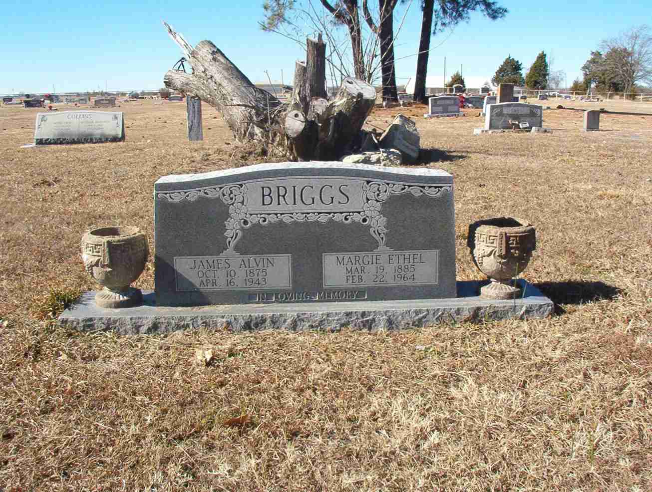 THE PARIS NEWS, Sunday, April 18, 1943, p. 4: "Veteran Peace Officer Dies -- [picture] J. A. (ALVIN) BRIGGS. Death of James Alvin Briggs of Rt. 2, Direct, Maxey community occurred Friday at 3:45 p.m. at his home after about two weeks' illness. He had been constable of Precinct 6 about 28 years. Born October 10, 1875, in Cass County, he had lived here 50 years, engaging in farming as well as serving as a peace officer. The Rev. W. R. Davis, Baptist pastor, conducted funeral services Saturday at 5 p.m. at Maxey Church, and Brown-Roden Funeral Home made internment in Tigertown Cemetery. Pallbearers were John Strother, R. O. Hindman, Thomas Swint, J. H. McCreight, S. E. Burton and J. F. Hood, members of the Lamar County sheriff's force being designated honorary pallbearers. He leaves his wife, the former Mrs. Ethel Burrow, and these children: Mrs. Roy Parks, Paris; Mrs. Reid Caldwell, Dallas; Mrs. Robert Hindman, Bonham; Mrs. Eugene Peek, Tremonton, Utah; Homer and Herman Briggs, Houston; Miss Jeanette Briggs and Barney Briggs, Maxey; nine grandchildren, and these brother and sisters: A. Briggs, Tigertown; Dee Briggs and Mrs. Eula Jackson, Dove Creek Colo.; Mrs. John Farris, Texarkana; Mrs. Netta Little, Selfs, and Mrs. Beulah Collins, Midland."