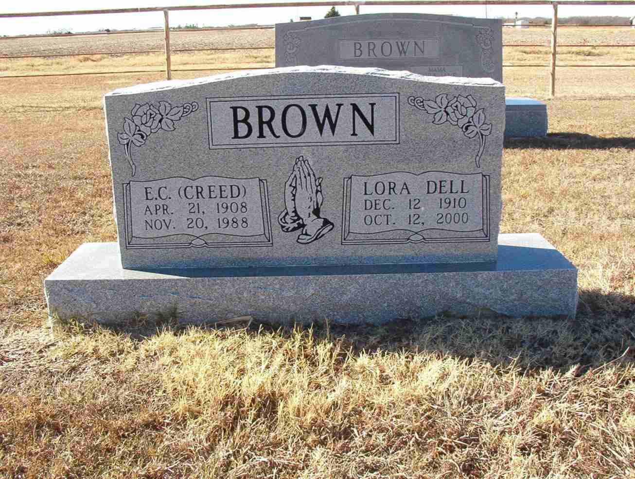 THE LAMAR COUNTY ECHO, 24 Nov 1988: 'E. C. (Creed) Brown, 80, of Tigertown died Sunday, 20 Nov 1988, at McCuistion Medical Center. Services were held Tuesday, 22 Nov, at Fry and Gibbs Funeral Home Chapel with the Rev. Kenneth Short and the Rev. Mike Fortenberry officiating. Burial was in Tigertown Cemetery. Mr. Brown was born 21 Apr 1908, in Tigertown, a son of Forrest Brown and Cora Jane Wood Brown. He attended Tigertown schools and Patterson Commercial College in Paris. On 11 Feb 1931, he married Lora Dell Carnahan. He was a farmer and rancher and he owned and operated a grocery store in Tigertown. He was a member of the Tigertown United Methodist Church. Surviving are his wife; one daughter, Mrs. Garth (Yvonne) Robinson of Tigertown; two grandchildren, Mrs. Charles (Laurie) Mallicote of Tigertown and Bryan Robinson of Tigertown; five great grandchildren; one sister, Mrs. Joe (Edna) Collins of Paris; and a nephew, Joe Creed Collins of Paris.'