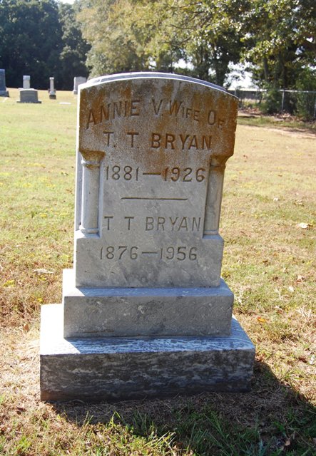 Tombstone is inscribed, “Annie V. Bryan 1881-1926 - Wife of T. T. Bryan.” On the same stone with T. T. Bryan.