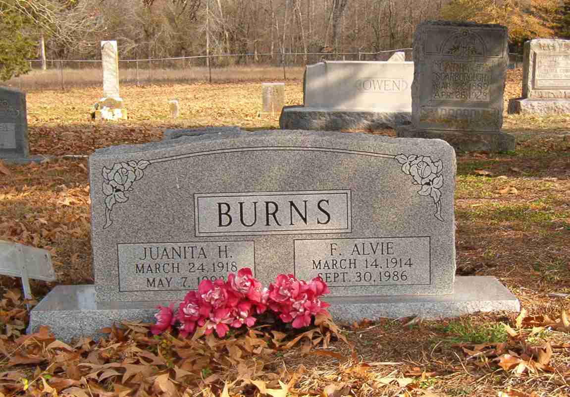 THE PARIS NEWS, Fri., May 8, 1998, p. 4B: 'Juanita Hope Burns, 80, of Amarillo, formerly of Paris, died Thursday, May 7, 1998, in Amarillo. Services will be at 11 a.m. Saturday, May 9, in Fry & Gibbs Funeral Home Chapel with Jay Spencer and Bob Crockett officiating. Burial will be in Sylvan Cemetery. The family will receive friends from 7-8 p.m. Friday at the funeral home. Mrs. Burns was born in the Sylvan community. She married Fred Alvie Burns in 1952. He died in 1986. She had been employed by Southwestern Bell Telephone Co. for 25 years and was a member of Southwestern Bell Pioneers Club and a member of the Retired and Senior Volunteer Program in Paris. She was a member of Central Church of Christ in Amarillo and a former member of Bonham Street Church of Christ in Paris before moving to Amarillo 11 months ago. Surviving are a son, Dr. Russell Burns and wife Cathy of Amarillo; three grandchildren, Allison, Clint and Lauren, all of Amarillo; and one sister, Doris V. Scales of Dallas. Pallbearers will be Joel Casey, Charles Casey, Larry Long, Wayne Kerby, Haskell England and Charles Arnold. The family requests memorial contributions be made to A. D. Panhandle Chapter Alzheimer's Disease and Related Disorders, 2200 West 7th St., Amarillo, TX 79106. A memorial service will be conducted in Amarillo at 4 p.m. Monday, May 11, at Central Church of Christ.'