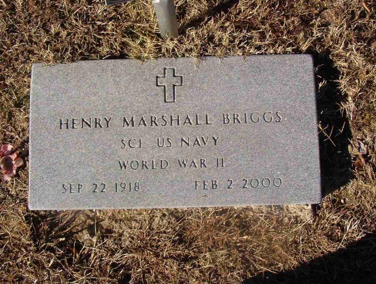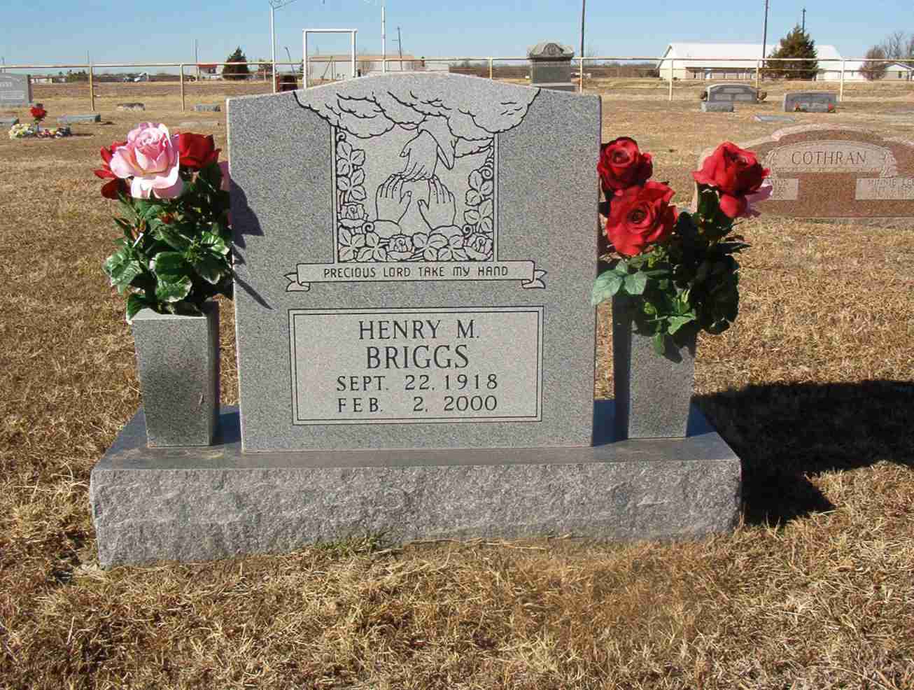 THE PARIS NEWS, Friday, February 4, 2000, page 8A: 'Henry Marshall Briggs, 81, of Paris died Wednesday, Feb. 2, 2000, at Parkview Nursing Home. Bright-Holland Funeral Home will conduct graveside services at 2 p.m. Saturday, Feb. 5, at Tigertown Cemetery with the Rev. Ray Helms officiating. Visitation will be from 7-8 p.m. Friday at the funeral home. The family will be at the home of Ray and Iola Hopkins in Caviness at other times. He was born Sept. 22, 1918, in Tigertown to Aaron Perry and Elba Adams Briggs. He served in the Army during World War II. Surviving are two daughters, Diane Thompson and husband Kenneth of Grants Pass, Ore., and Marlene Kelley and husband Dennis of Ventura, Calif.; a grandson, Scott Kelley of Ventura, Calif.; two sisters, Jimmie Ruth Briggs of Paris and Iola Hopkins and husband Ray of Caviness; a brother, Robert Briggs and wife Delma of Grand Prairie; two nephews, four nieces, several great-nieces and nephews; and special friends, Robert and Alice Roberts of Tigertown. He was preceded in death by three sisters. Honorary bearers will be Carl Roberts, Craig Roberts, Herman Briggs, Barney Briggs, James Wright and Gene Baker.'