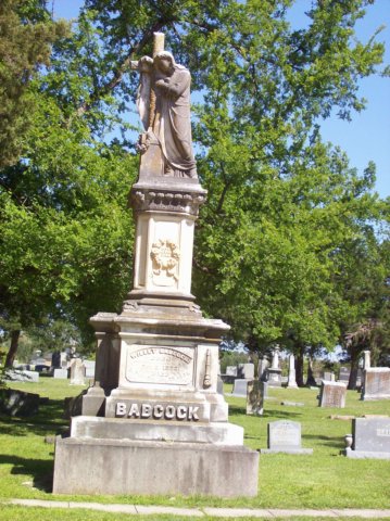 THE DALLAS MORNING NEWS, Tuesday, May 1, 1979, p. 3C; '... The 20 foot tall statue of an angel or saint leaning on a cross is certainly for real. Erected in 1881, the life sized figure topping an elaborate 6 foot pedestal still stands, and the religious robe clad statue still wears cowboy boots. The pedestal, inscribed 'Willet Babcock, Oct. 6, 1828, died 1881, Love Never Dies', also features upside down torches, symbolizing the end of a life. No one can figure why Babcock's, monument features the cowboy boots, because he was a cultured gent, owner of an opera house and manufacturer of fine furniture. It's unlikely he died with his boots on. This monument with a sense of humor was created by German stone mason Gustave Klein, who made many of the more elaborate tombstones in the Paris cemetery. Another of his massive works memorializes Capt. J. N. Adams...'